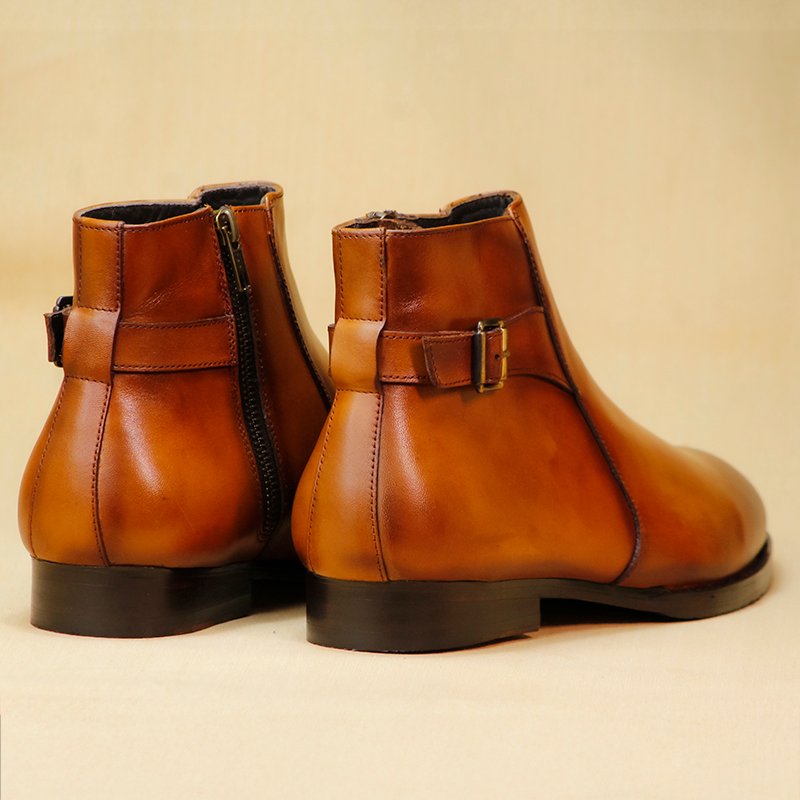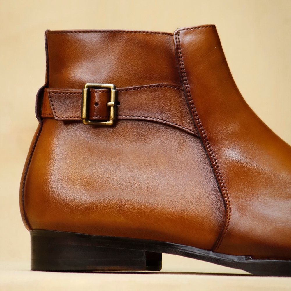 Crafted from premium full-grain tan leather, this ankle boot blends timeless elegance with modern functionality. The smooth finish, side zipper, and antique-finish buckle offer refined detailing, while the solid wood sole grounds the design in artisanal heritage. Every pair is meticulously handmade, reflecting Shobespoke commitment to quality, comfort, and elevated style.