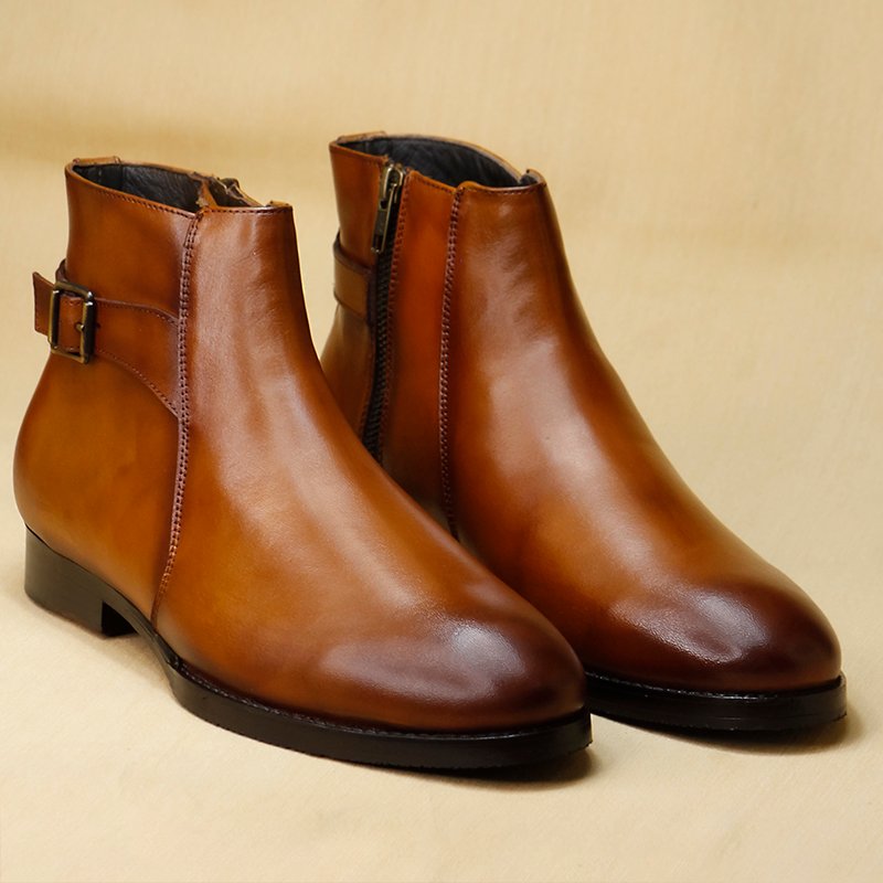 Handcrafted in rich tan leather with a solid wood sole, the Alderwood Tan boot by Shobespoke blends timeless elegance with artisan detail. Featuring a sleek side zipper and antique buckle strap, it’s designed for comfort, style, and premium impact.