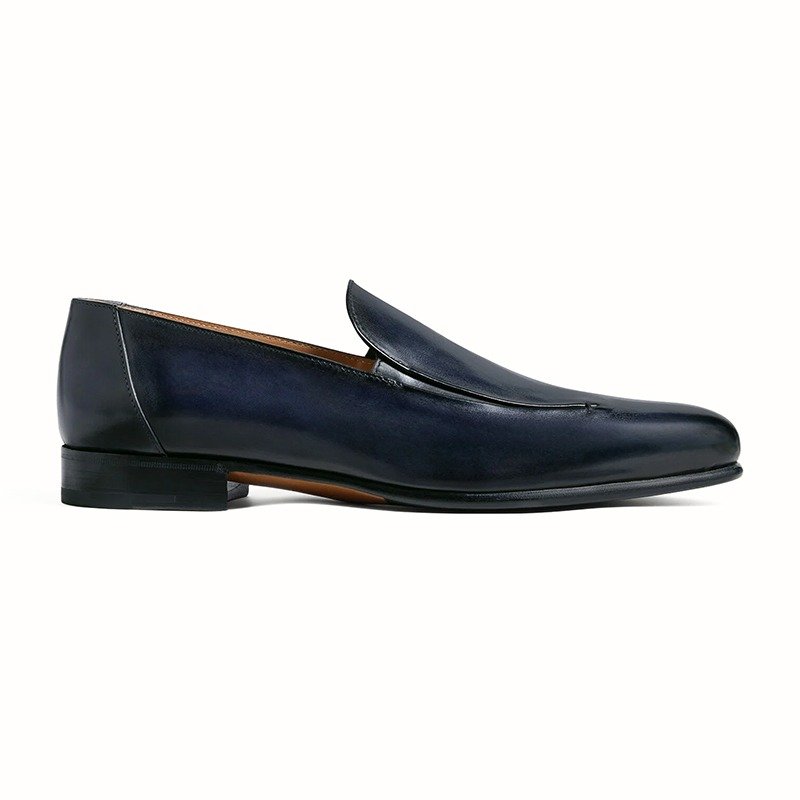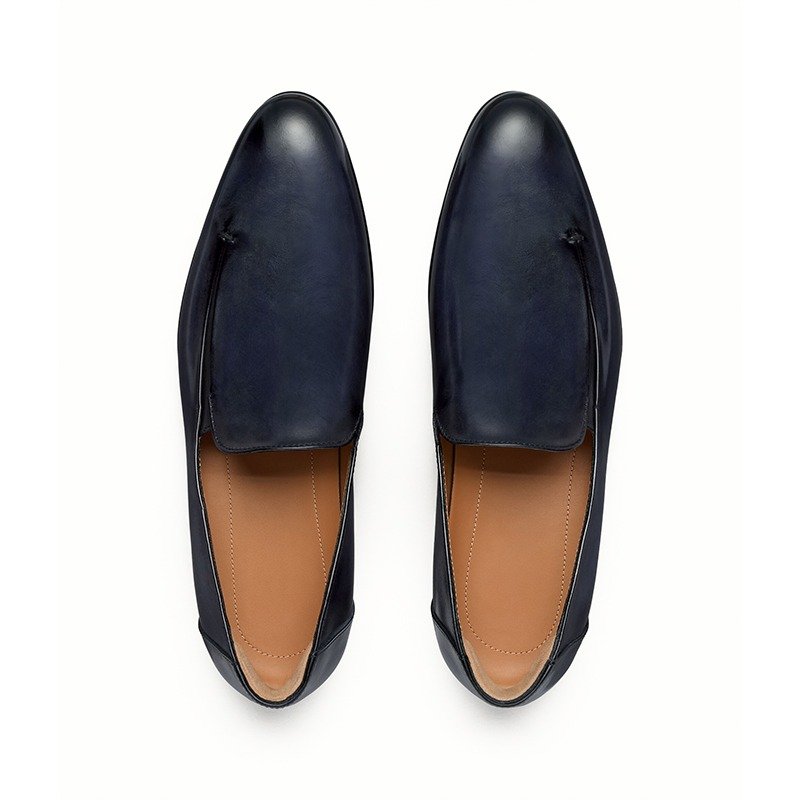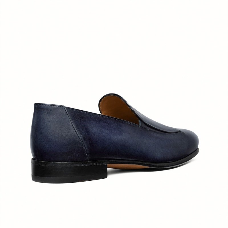 Handcrafted navy blue leather loafers with leather sole by Shoe Bespoke. Sleek slip-on design with a refined premium finish.