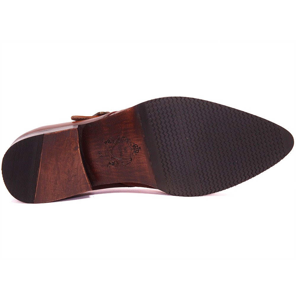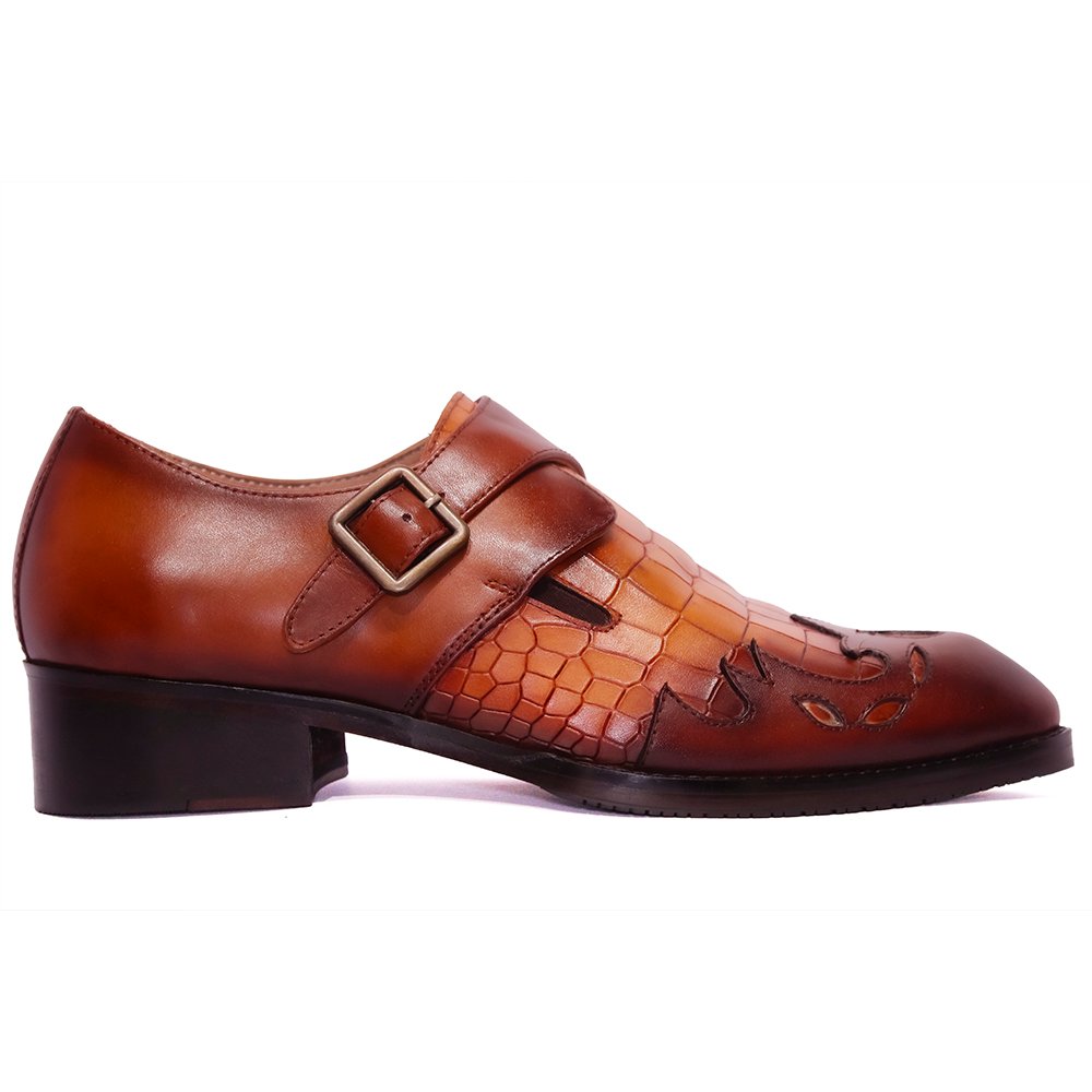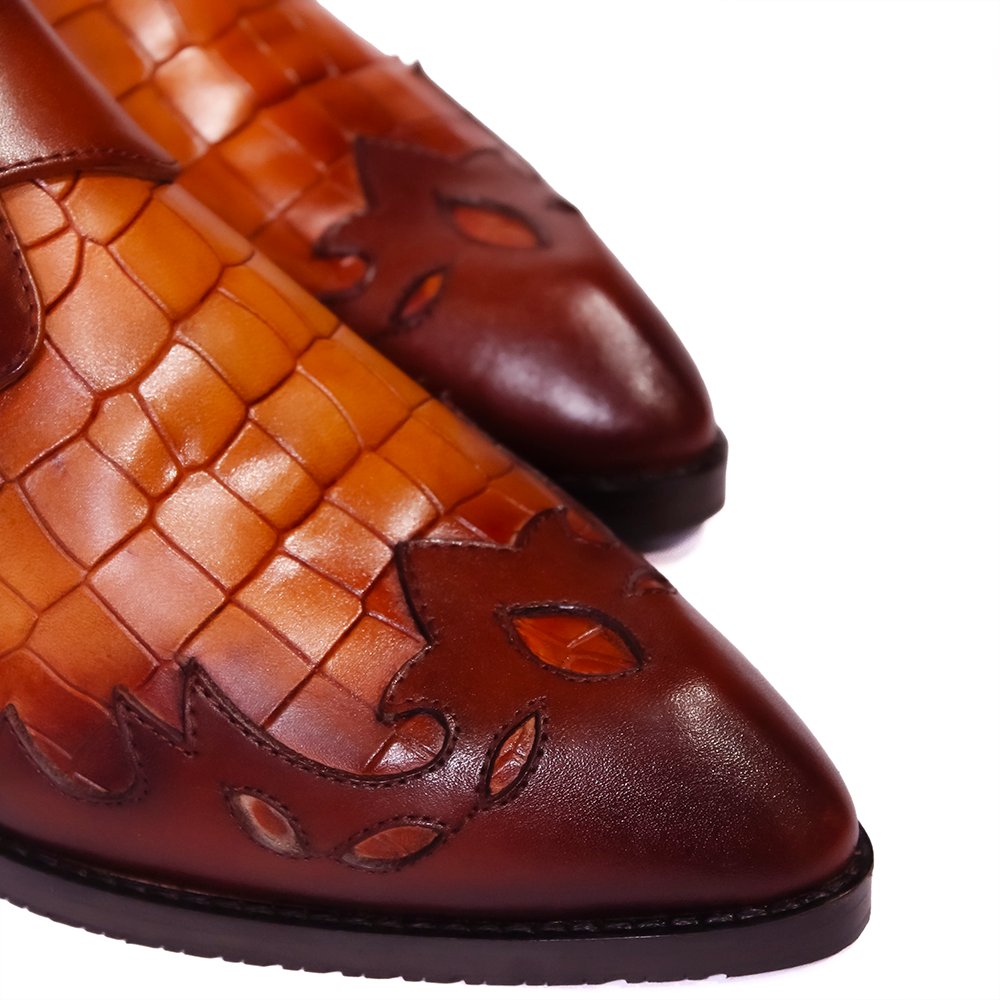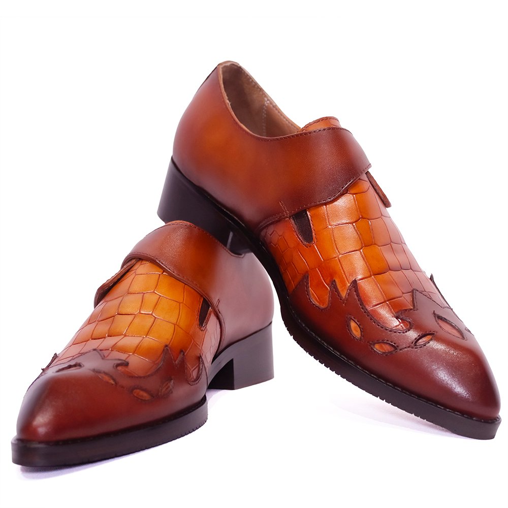 Auburn Viper Monk- ShoeBespoke,, a statement piece that merges bold artistry with timeless craftsmanship. Handcrafted from the finest Italian leather, these bespoke shoes feature an exquisite embossed pattern inspired by exotic textures, layered in rich shades of burnished tan and chestnut brown .The single monk strap, fastened with a polished brass buckle, lends an air of refined sophistication, while the intricate flame-like detailing across the vamp adds a unique expression of individuality. Each pair is meticulously custom-made, shaped to the client’s exact measurements, ensuring a flawless fit and effortless comfort.