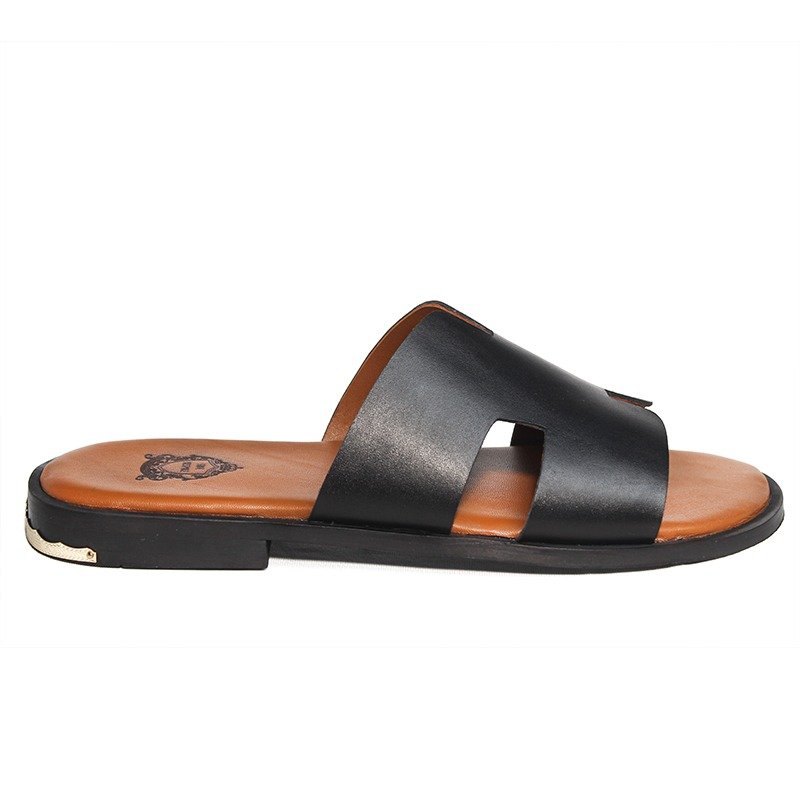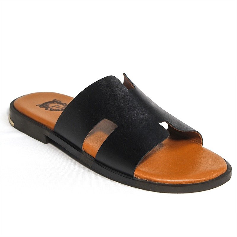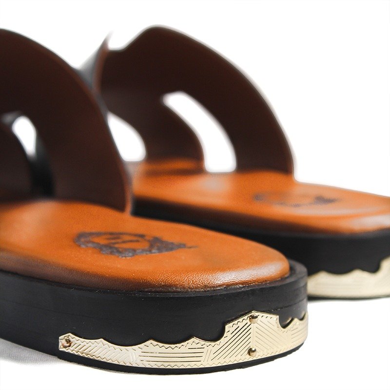 Handcrafted pure leather slide in black with engraved metal detail, leather sole, and premium comfort by Shoe Bespoke.