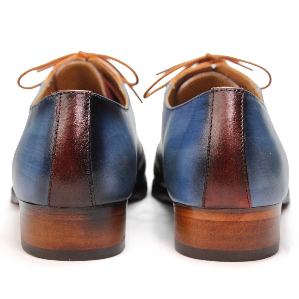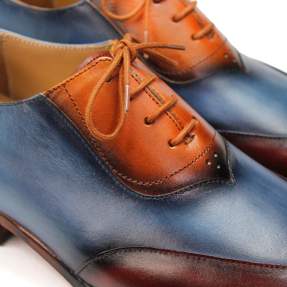 Azure Ember Gradient Leather Oxfords - Introducing the “Azure Ember” by Shoe Bespoke—a masterfully handcrafted pair of pure leather customized shoes that redefine elegance. Designed for the discerning gentleman, these Oxfords feature a striking gradient palette that transitions from deep espresso at the toe to a rich sapphire along the sides, finishing in warm amber tones near the laces. The brogue detailing adds a layer of classic sophistication, while the closed lacing and sleek silhouette speak to timeless craftsmanship.