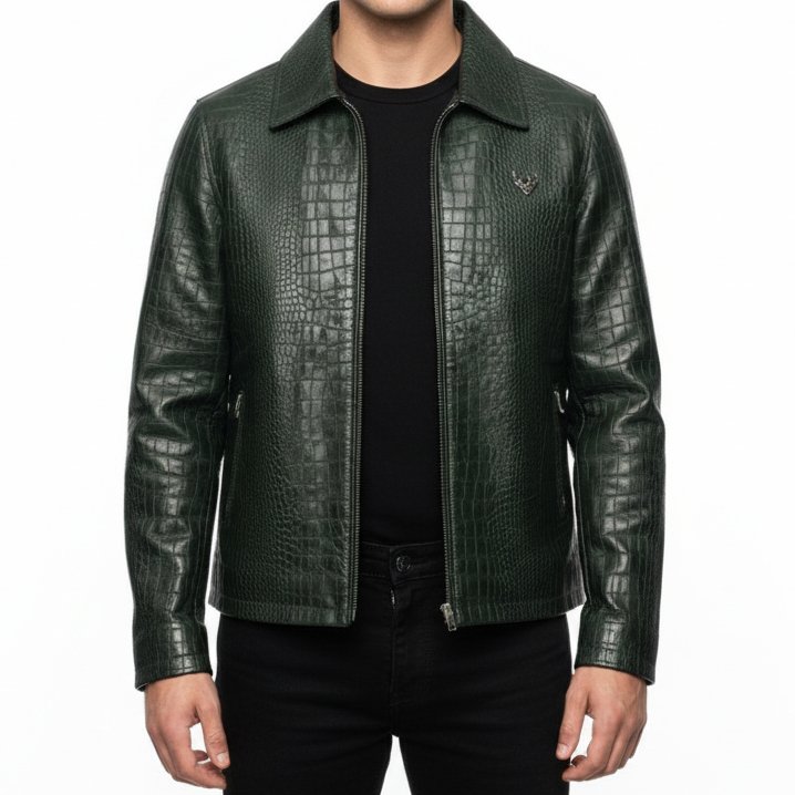 Cavalieri Verde Croc Jacket by MITCH LUXURY Handcrafted pure leather jacket in a deep green croc texture from MITCH LUXURY, tailored to perfection for the discerning customer seeking exclusivity, comfort, and statement style.