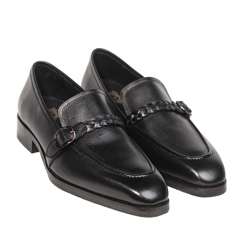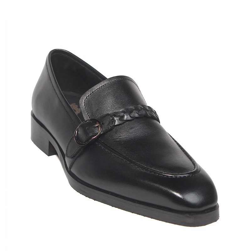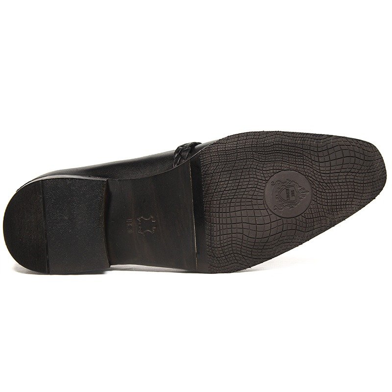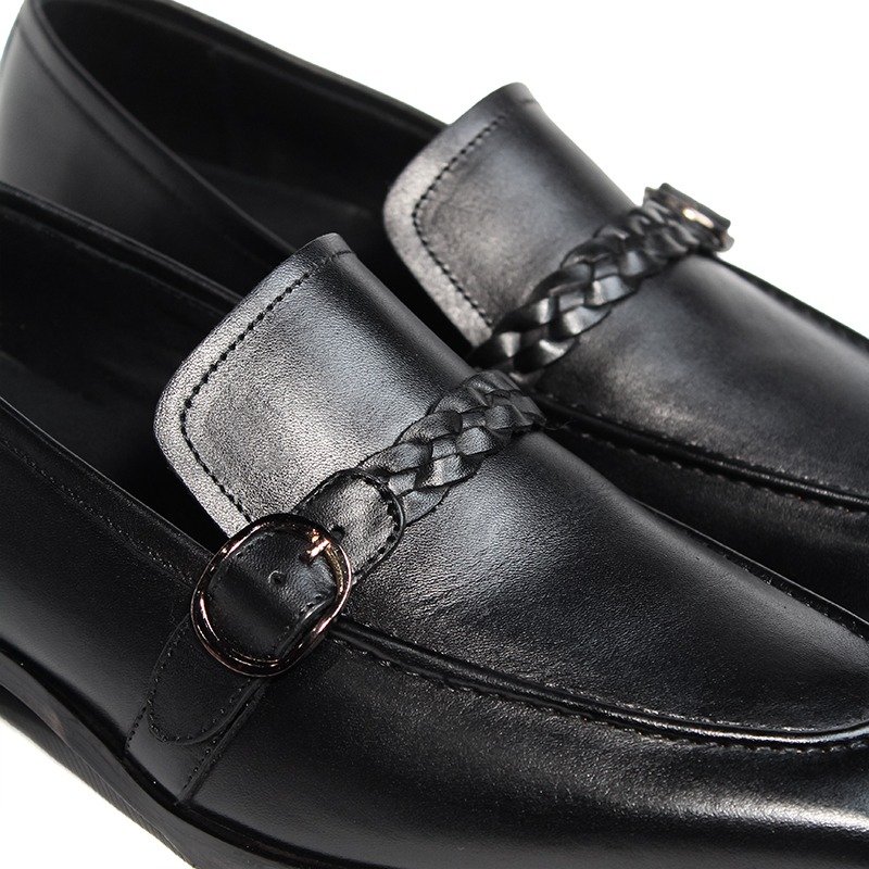 Shoe Bespoke Cavero Braid Loafers are crafted for modern elegance with a distinctive edge. Made from pure black leather, these handcrafted loafers feature a sleek silhouette enhanced by a refined braided strap with buckle detail, adding subtle character to a classic design.