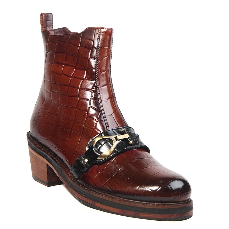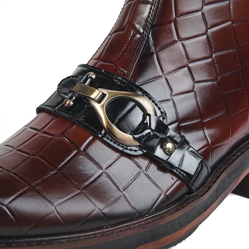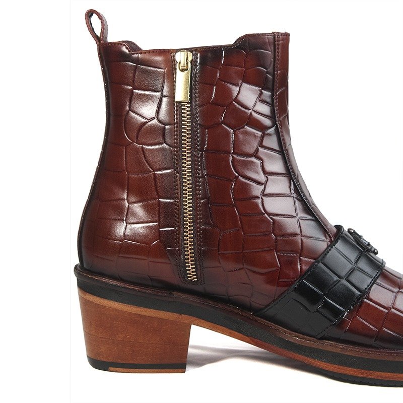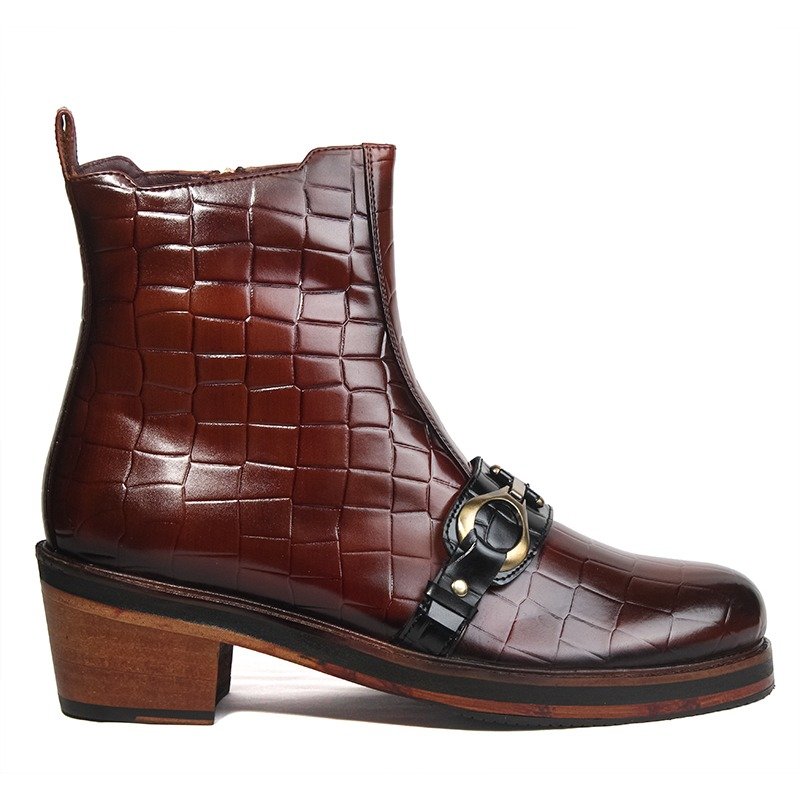 Handcrafted tan brown croc-texture leather boots with buckle and leather sole by Shoe Bespoke. Bold design with premium luxury finish.