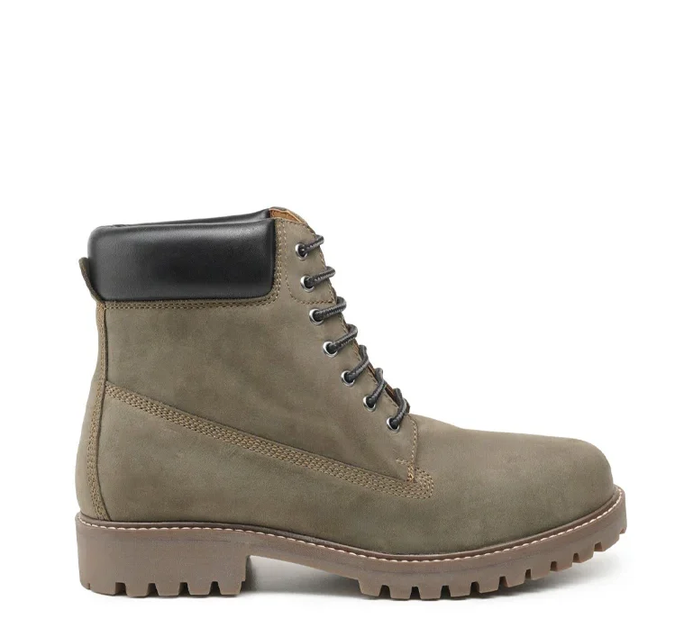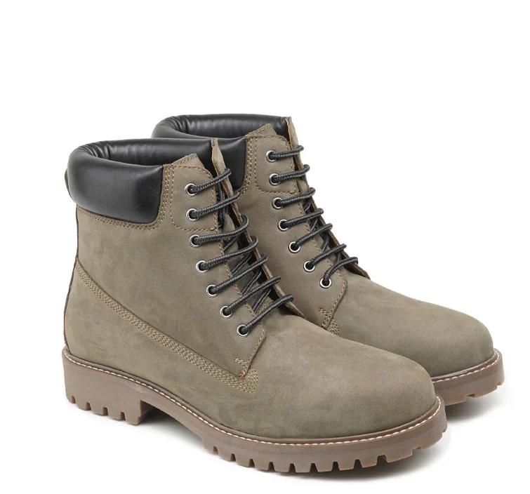 Handcrafted grey nubuck leather lace-up boots with rugged rubber sole, offering durability, comfort, and everyday versatility.