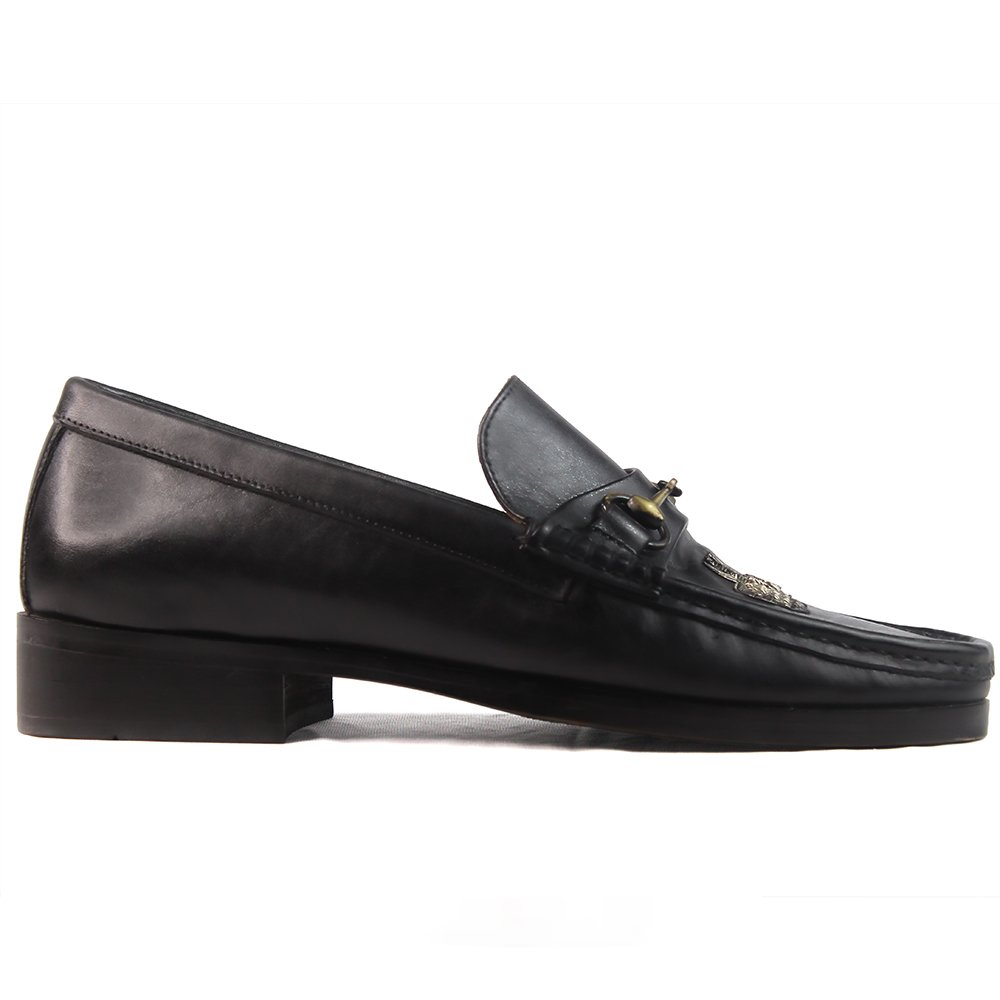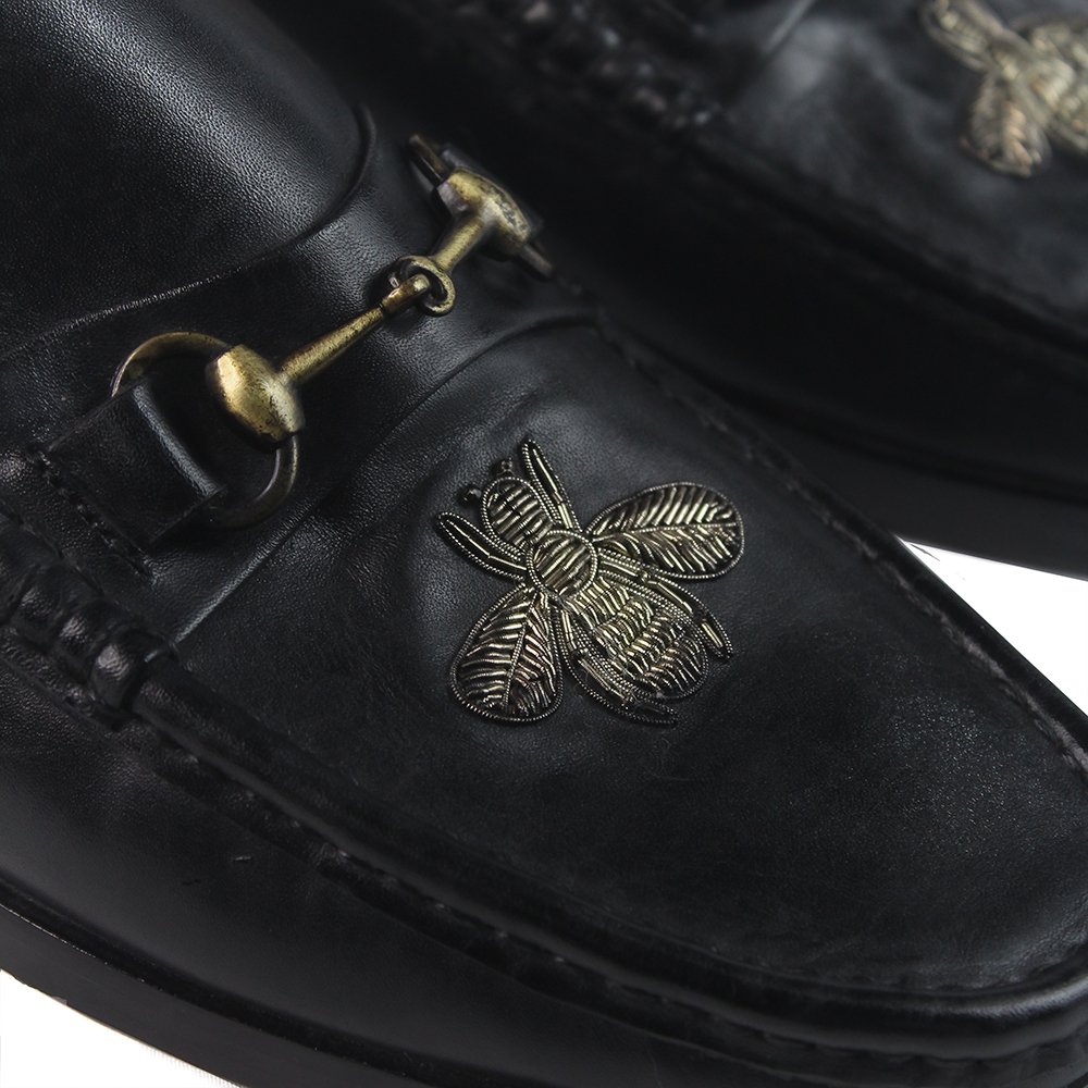 Gucci Bee by ShoeBespoke Crafted from rich, supple black leather, this shoe features the signature antique brass-tone horsebit accented by a meticulously embroidered bee motif on the vamp. This unique customization transforms the shoe into a truly distinctive piece. Our dedicated bespoke bee loafer service ensures an anatomical fit, meticulously molded precisely to your foot's unique contours, guaranteeing personalized comfort that lasts.