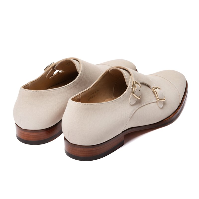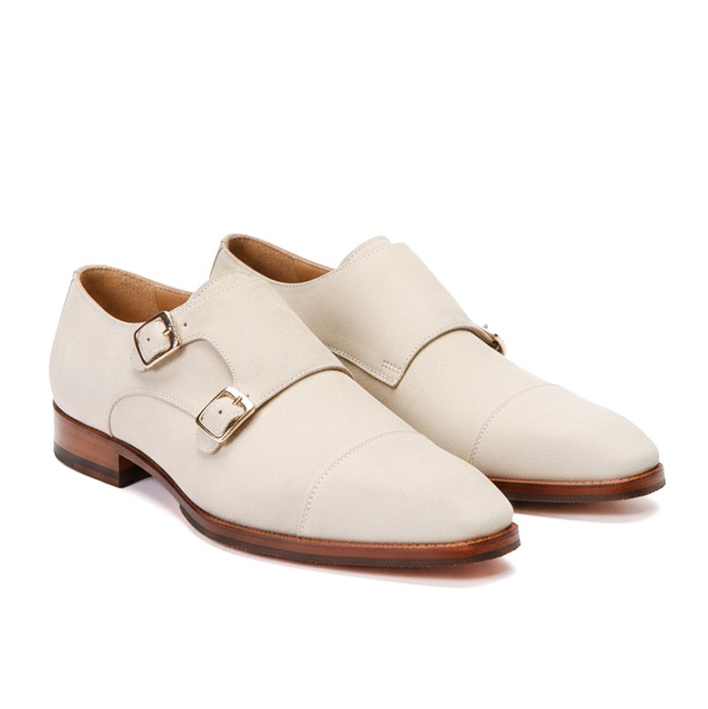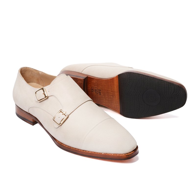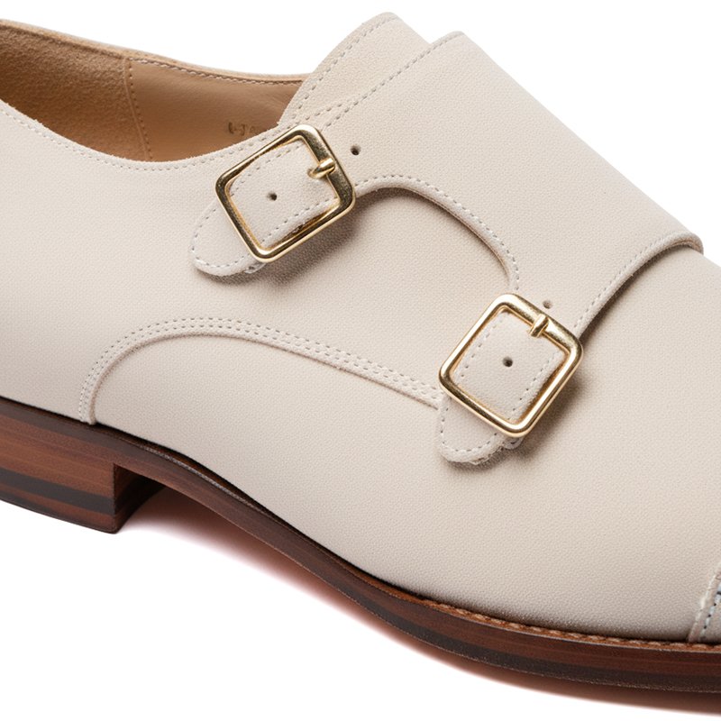 A handcrafted off-white suede leather monk shoe with a refined double-strap design and leather sole — created for understated elegance and modern bespoke style.