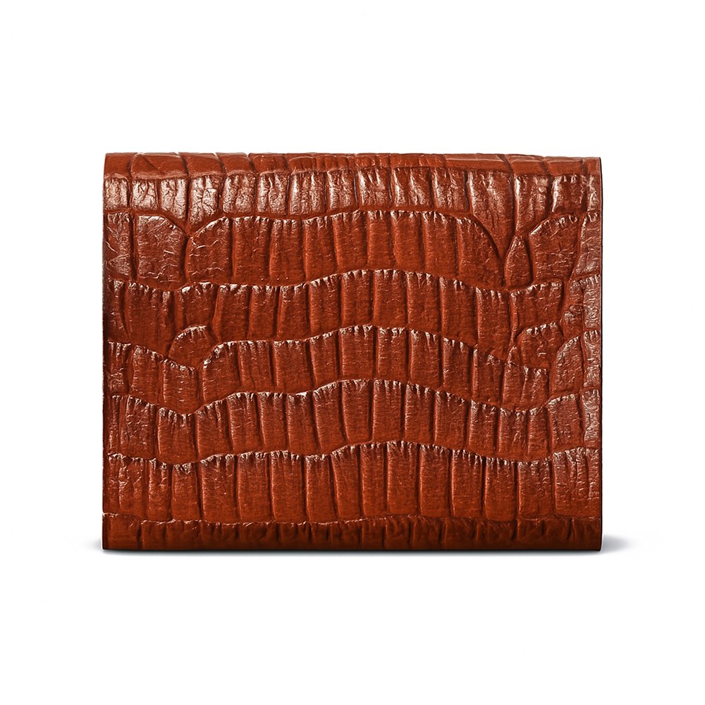 Built for individuals who refuse to compromise between aesthetics and practicality, the Hettich Croc Wallet showcases an elegant envelope-style construction. A gleaming brass button clasp secures your essentials with understated polish, while the interior reveals intelligently organized compartments for cards, receipts, and currency. The warm tan leather matures gracefully over time, developing a distinctive patina that enhances its premium character with daily use.