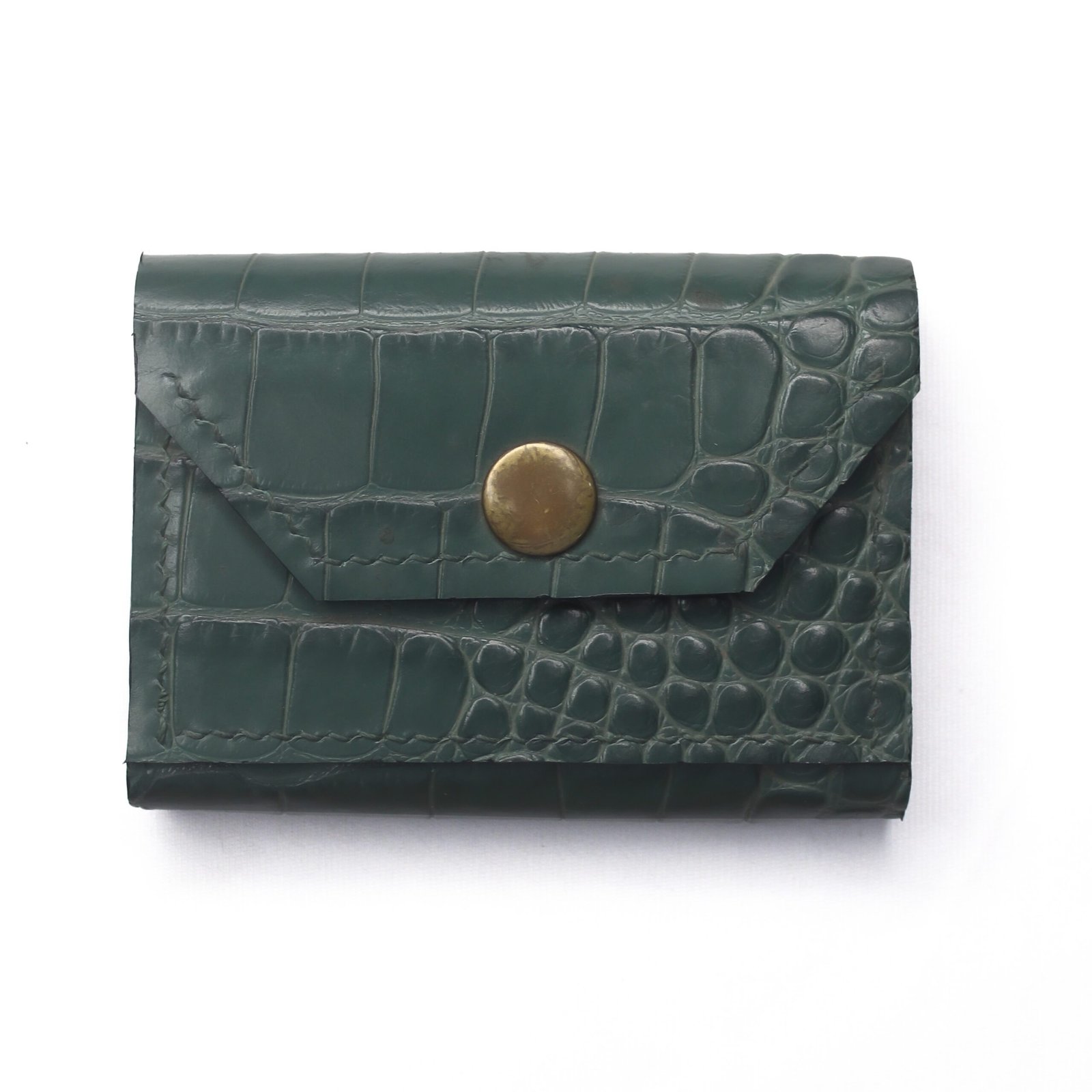 Handcrafted from crocodile-embossed green leather, the Mitch Scarlet Wallet features a brass snap closure and envelope-style elegance.