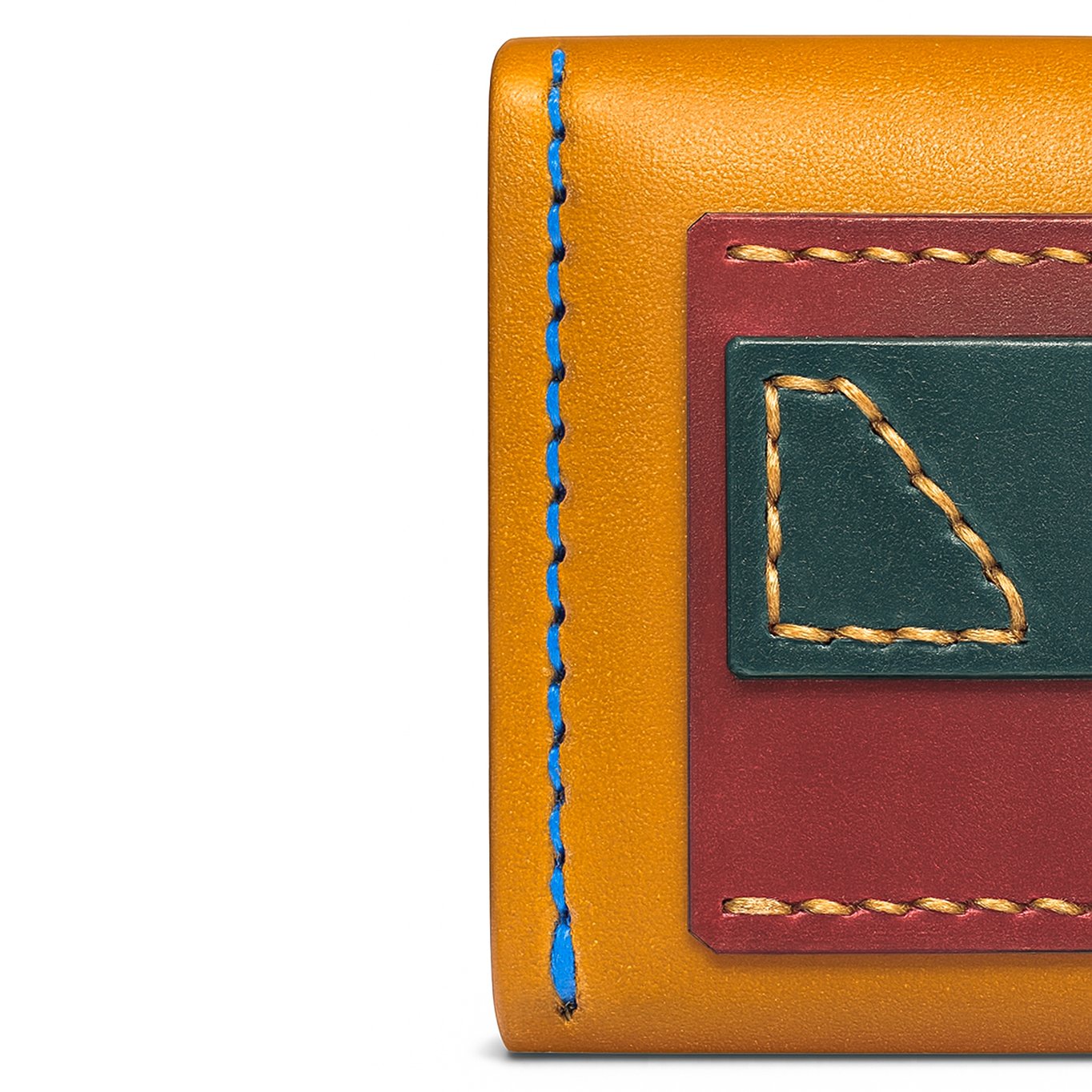 Mitch Hettich Multi Yellow Edition is a refined expression of bold minimalism. This Mitch customized wallet pairs a warm orange-brown leather body with a deep burgundy front pocket, stitched in vibrant yellow for a striking contrast. The color palette evokes warmth, confidence, and individuality—perfect for those who appreciate expressive design with functional elegance.