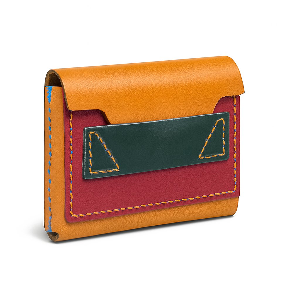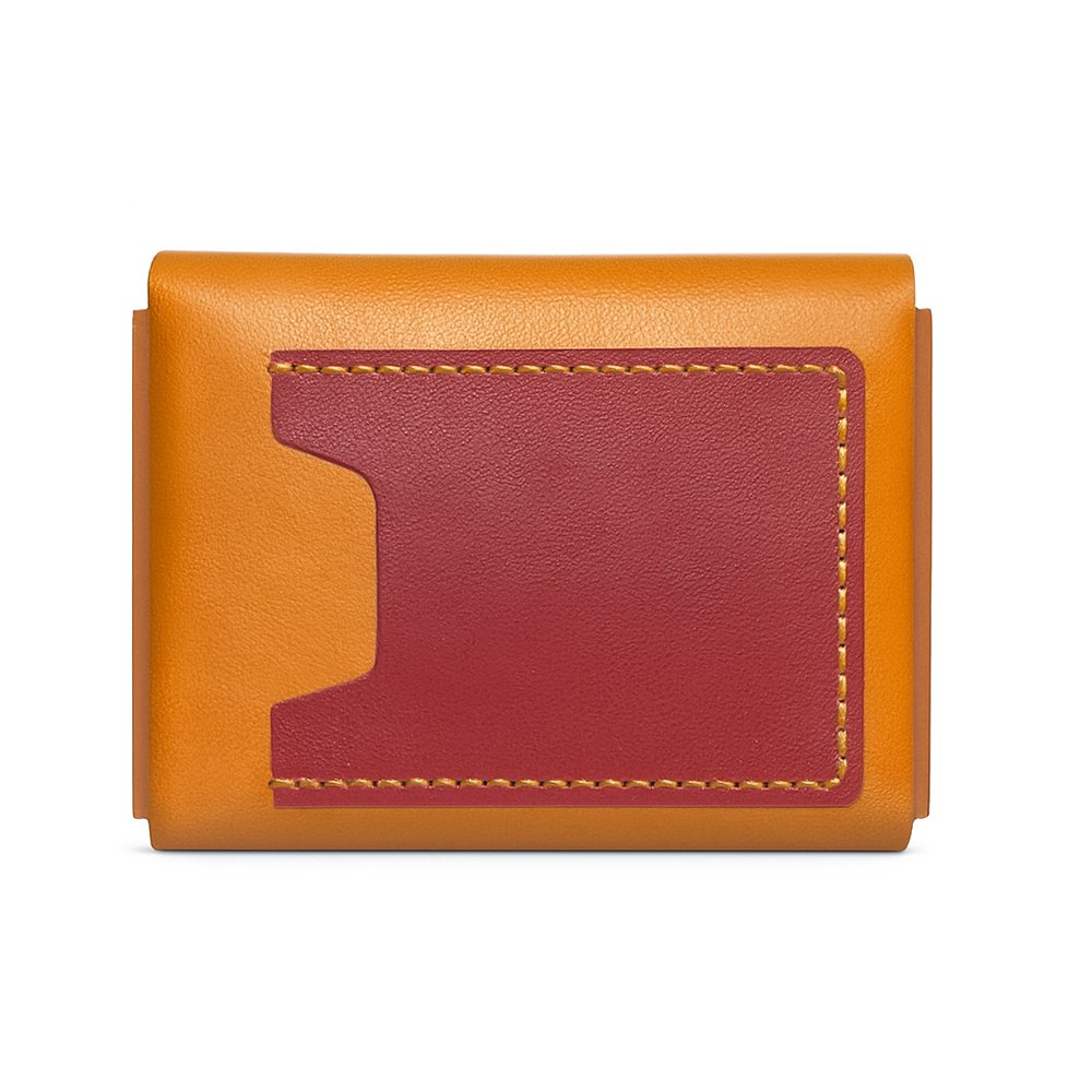 A handcrafted Mitch customized wallet in orange and burgundy leather, stitched in yellow. Compact, premium, and tailored for bold minimalists.