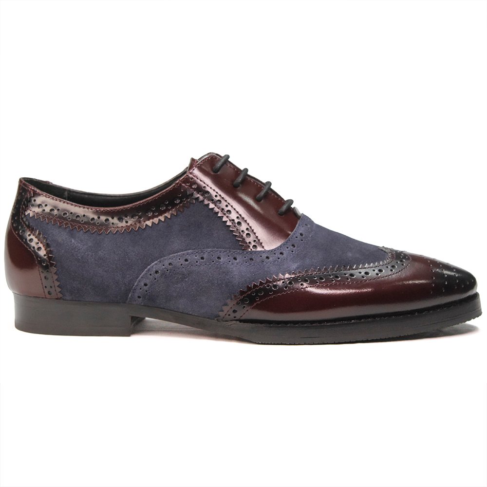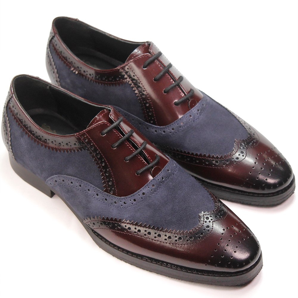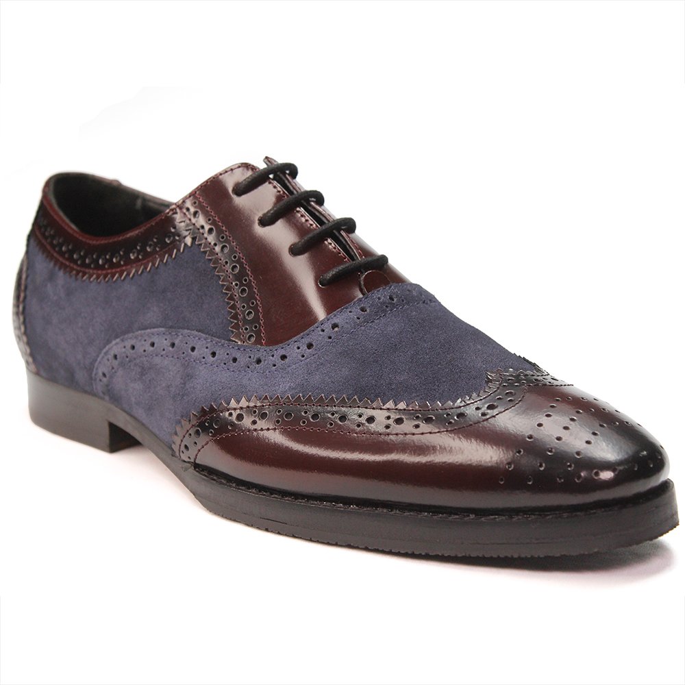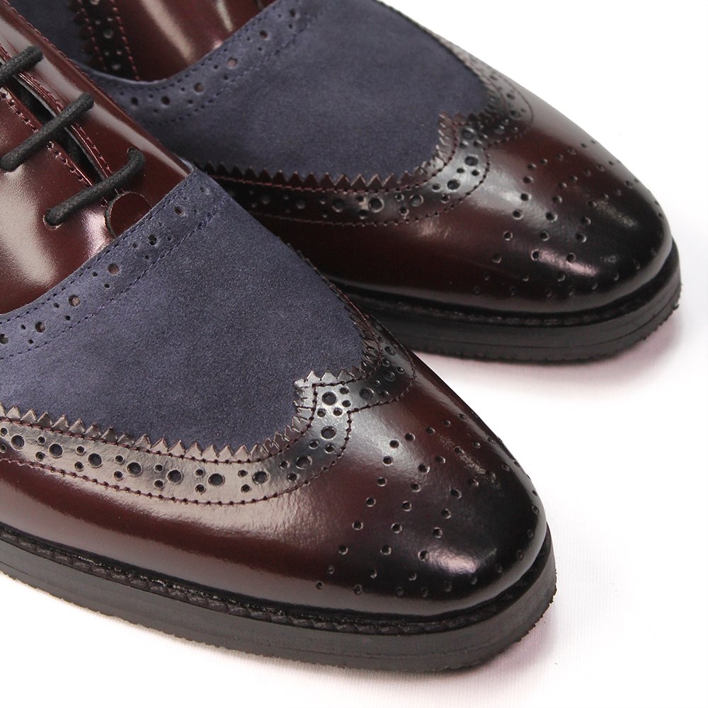 Navy Claret Two-Tone Oxford - Shoe Bespoke’s “Navy Claret” Two-Tone Oxford are a bold expression of refined craftsmanship and personal style. These pure leather customized shoes are handcrafted using a striking combination of glossy claret leather and deep navy suede, creating a rich interplay of texture and tone. The classic brogue detailing—perforated accents along the wingtip and heel—adds timeless character, while the closed lacing system ensures a tailored, elegant silhouette.