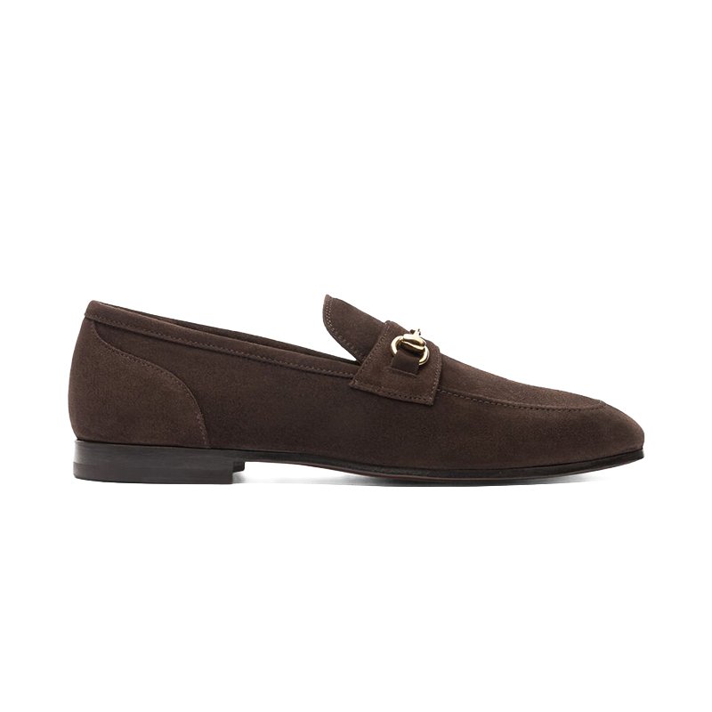 Handcrafted suede leather loafer with elegant metal bit detail and solid wood sole, designed for refined style and all-day comfort.