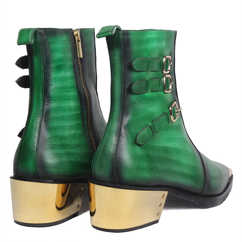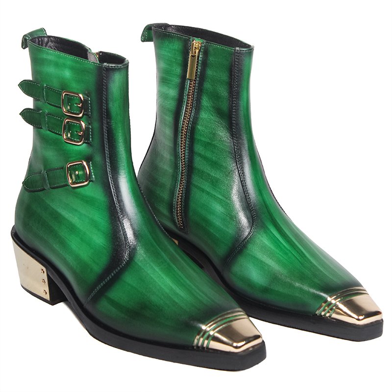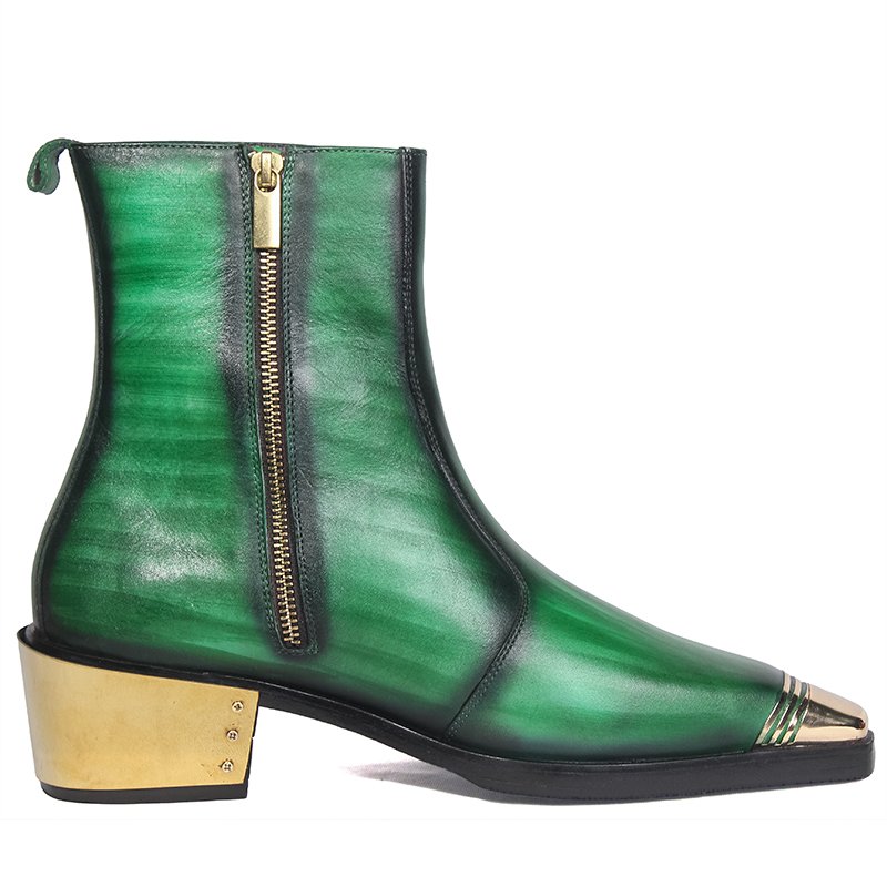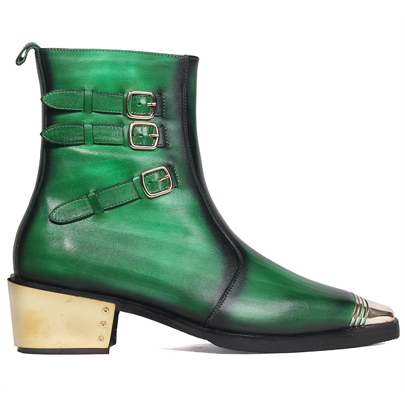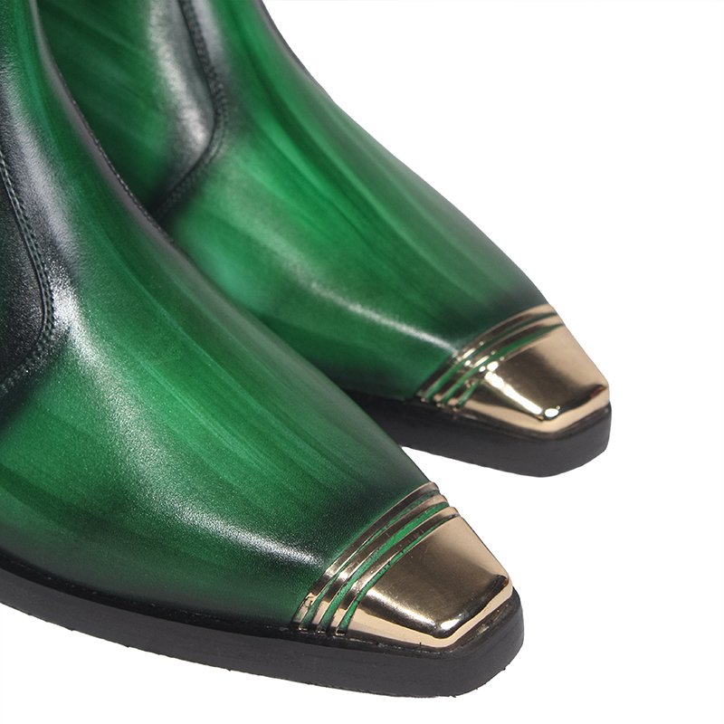 A bold handcrafted green leather boot made from premium calf leather, featuring a metal toe cap and metal heel, finished with a classic leather sole.