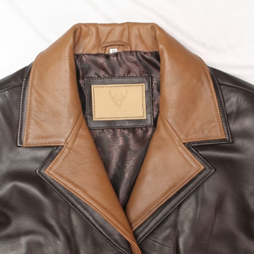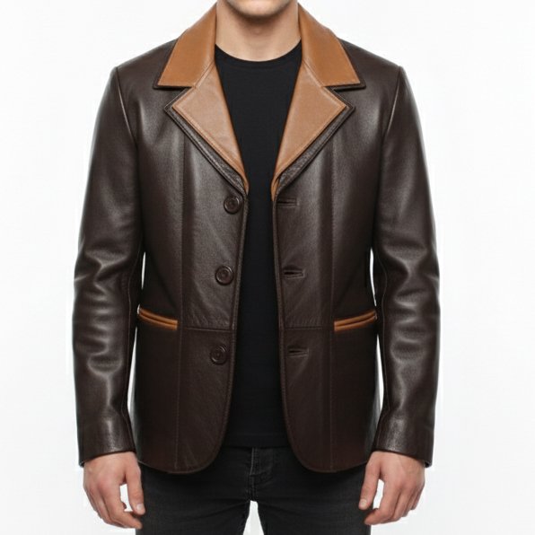 The Luxury Elan Blazer, a masterstroke in pure leather craftsmanship by Mitch Luxury. This premium blazer blends timeless tailoring with a bold, dual-tone aesthetic—featuring a rich espresso brown body contrasted by a warm tan leather collar and lapel. Designed for the discerning dresser, it offers a structured silhouette with sharp shoulders, three-button closure, and zippered pockets trimmed in tan for a refined finish.