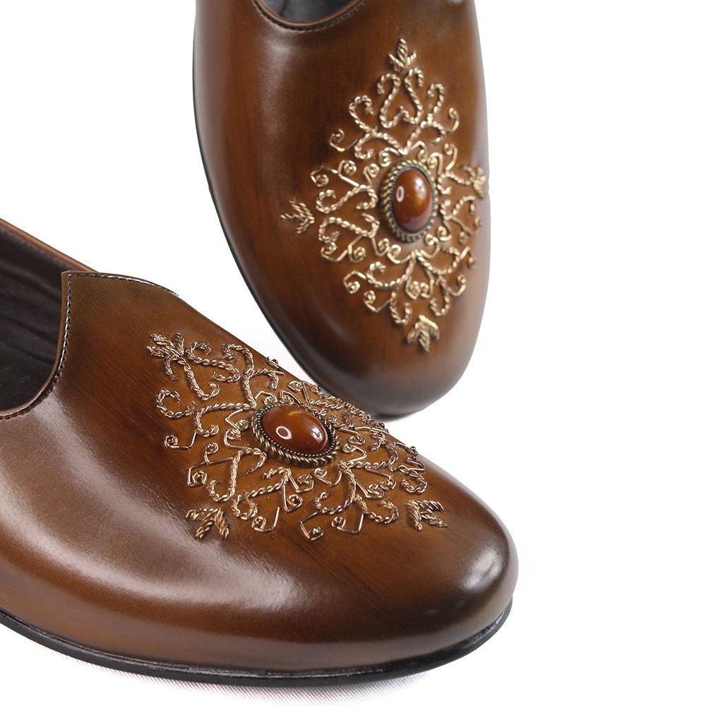 The Maharaja Ember a ShoeBespoke exclusive that reimagines ethnic footwear through the lens of artisanal luxury. These customized ethnic shoes are meticulously handcrafted using premium brown leather, chosen for its supple texture and enduring charm. The upper features intricate gold-thread embroidery in a symmetrical floral motif, accented by a central ornamental bead—each detail echoing heritage craftsmanship.