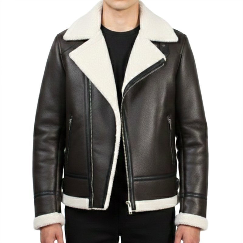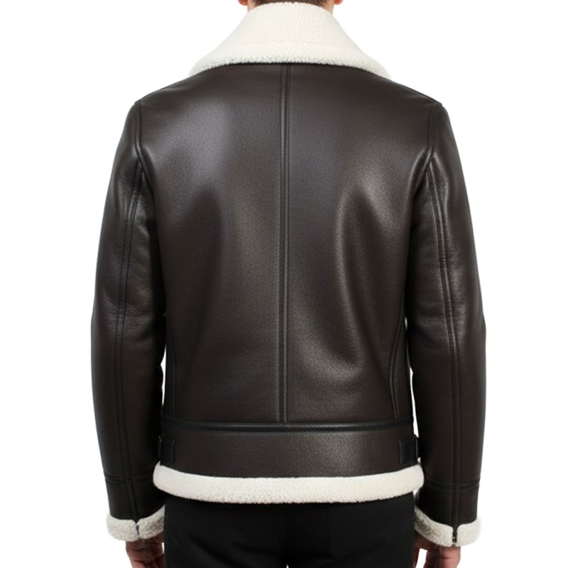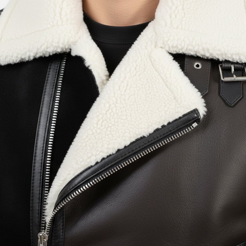 A bespoke black leather aviator jacket handcrafted from pure leather, featuring a shearling-style collar and refined detailing for timeless luxury.