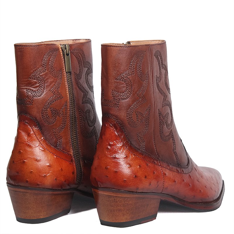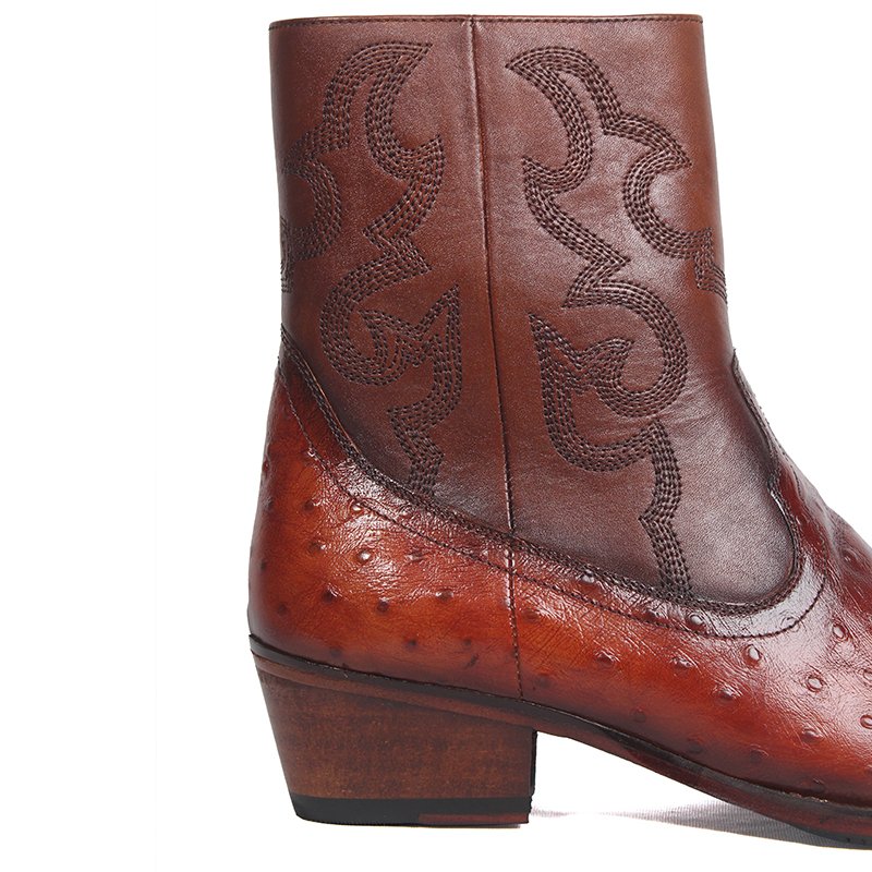 A handcrafted brown leather boot made from premium calf leather with ostrich leather detailing and engraved patterns, finished with a classic leather sole.