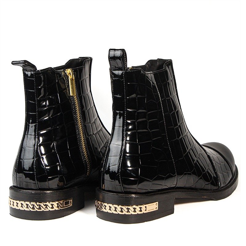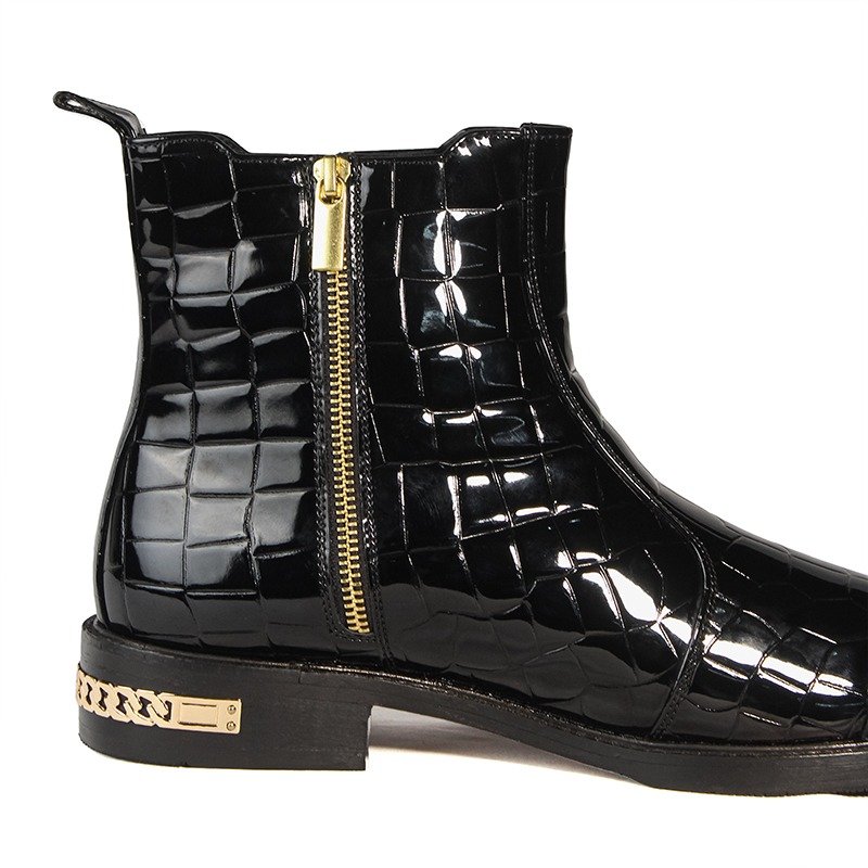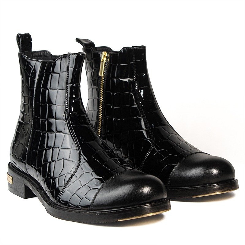 Handcrafted black patent leather boots with metal toe and back detail, leather sole by Shoe Bespoke. Bold design with a luxury finish.